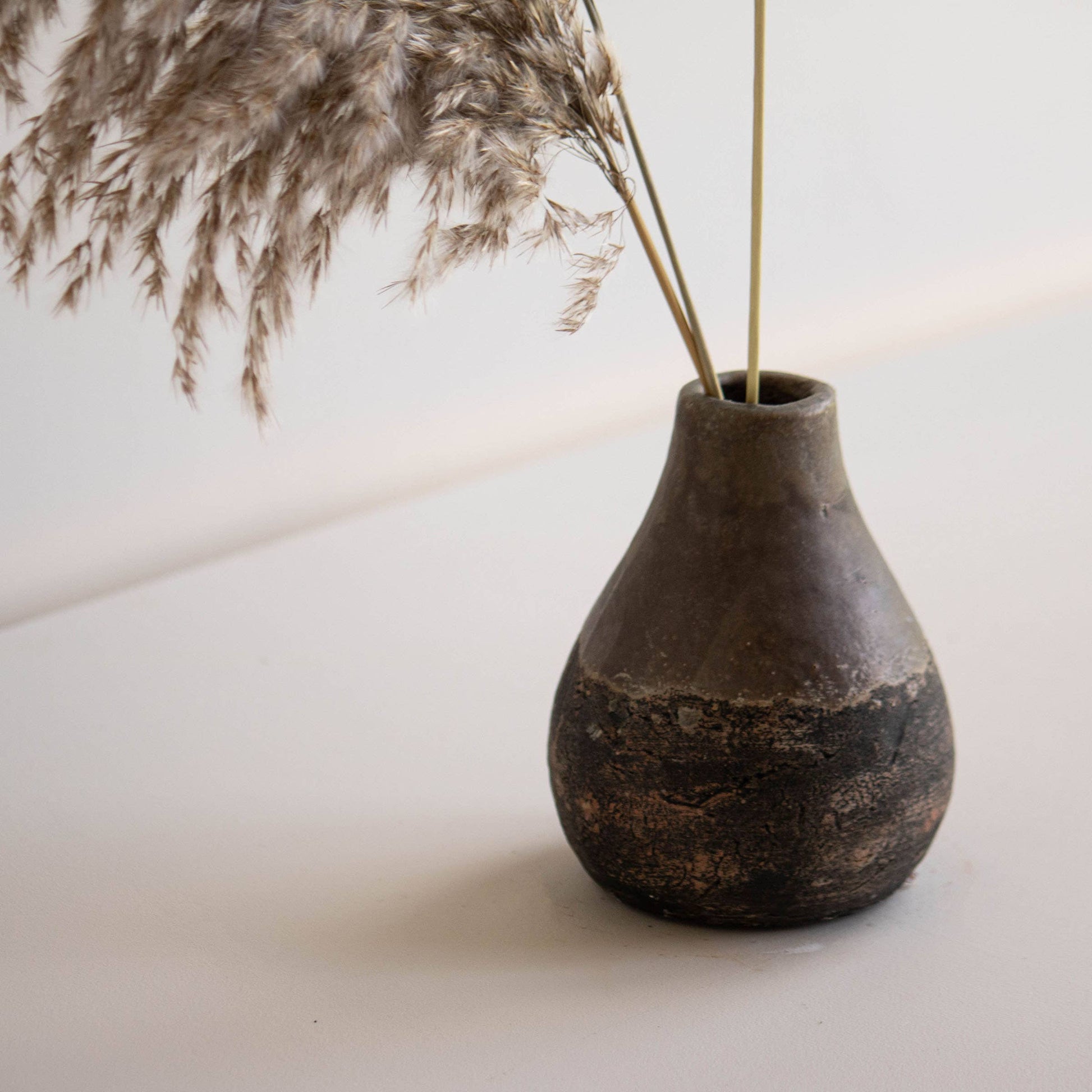 The Gita Rustic Terracotta Vase features a natural matte glaze that gives it a raw, earthy textural finish and has 3 foam feet on the bottom. Tones of charcoal gray and earthy brown will add a rustic touch to your home with or without stems added.