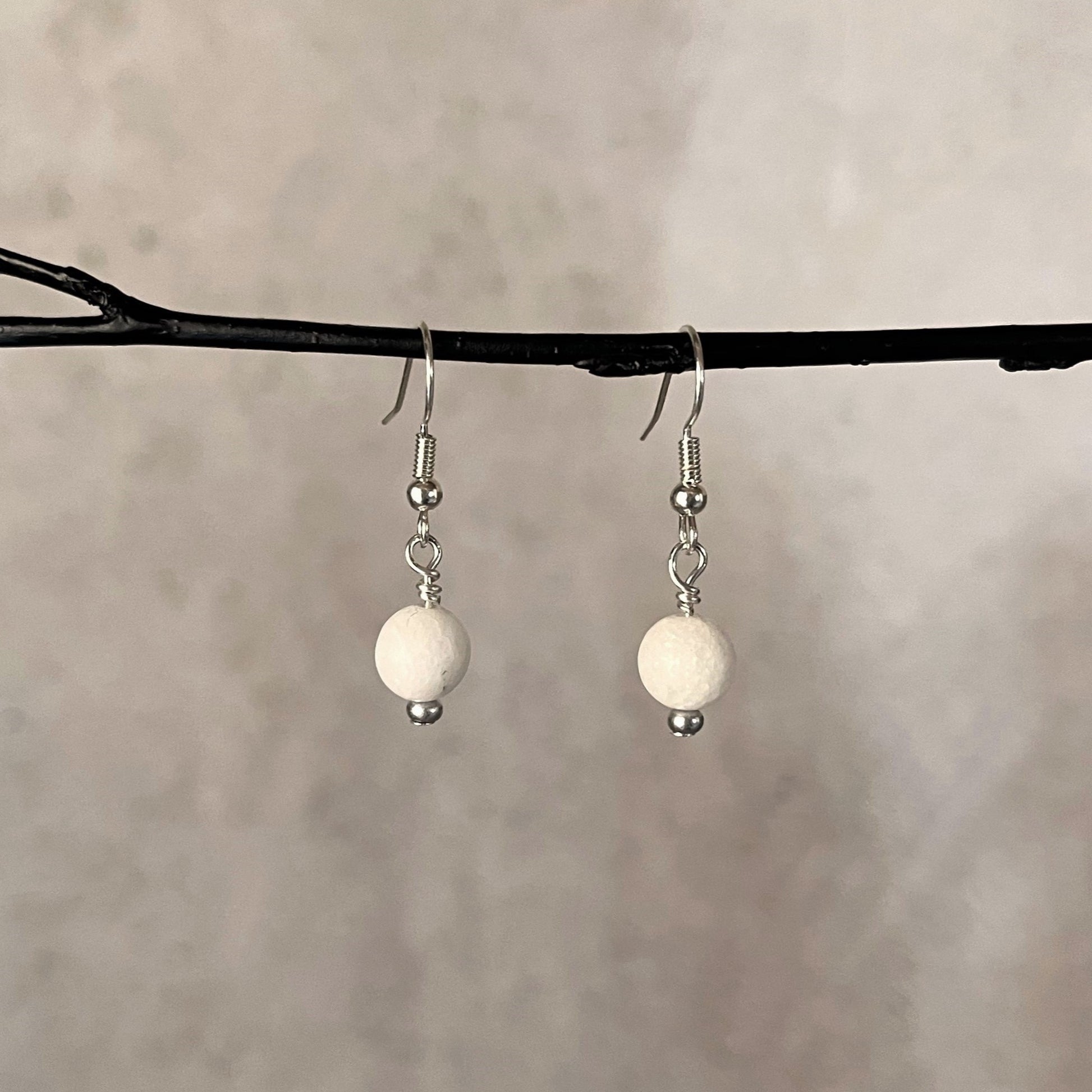 Elevate your style with our White Jade Drop Earrings. These minimal but elegant earrings feature natural 8mm matte white jade beads, available with gold or silver plated hardware.